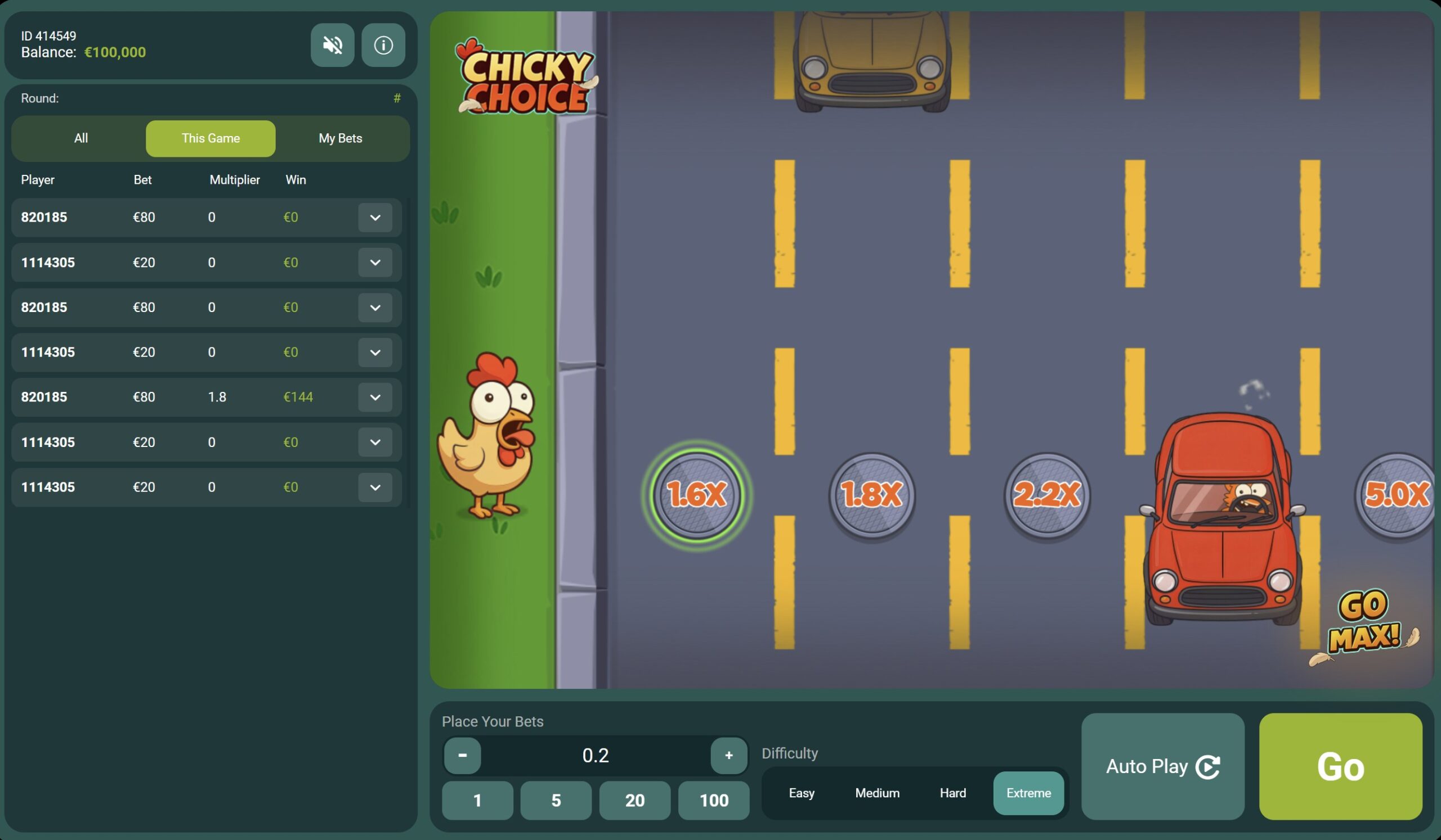 Toisin kuin tyypillisissä kaavoissa, joissa luvut nousevat, kunnes tapahtuu arvaamaton romahdus, Chicky Choice kutsuu osallistujat ohjaamaan nokkela kanahahmo vaarallisilla poluilla. Jokainen liike punnitsee jatkuvasti riskiä ja palkkiota, kun väijyvät ketut lisäävät jännitystä. Nousevien kertoimien ja tiheiden rahastointimahdollisuuksien ansiosta jokaisella päätöksellä on merkitystä.