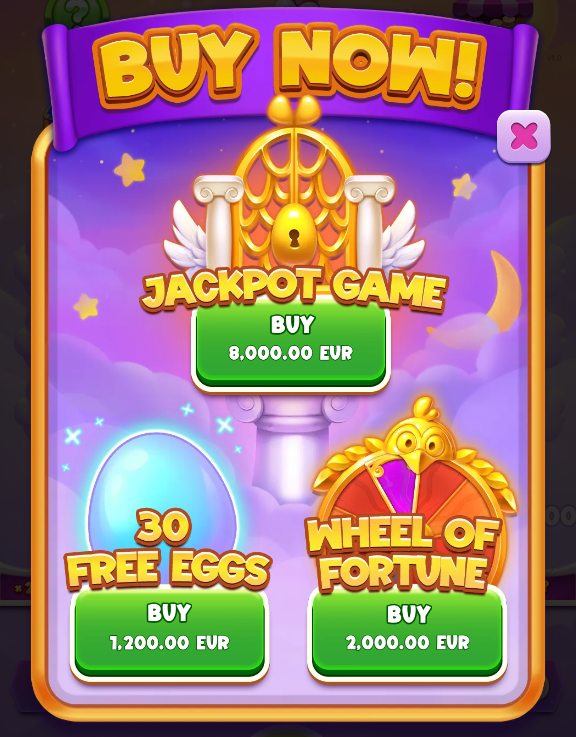 | 특징 | Wheel of Fortune, Jackpot Game, 30 free eggs |