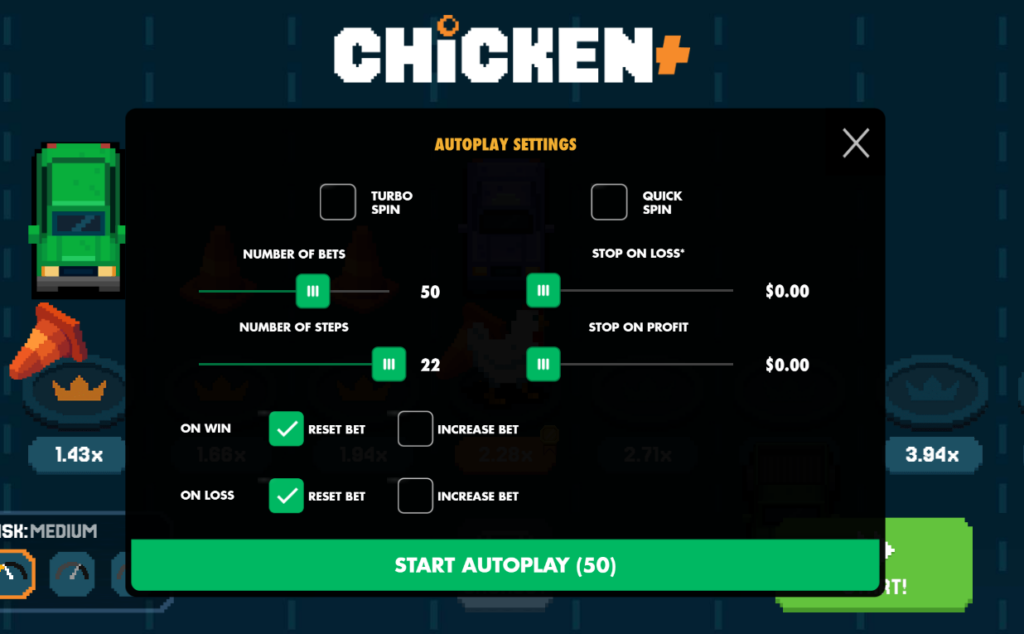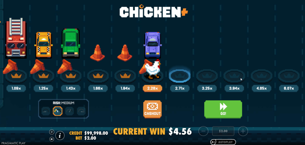 Here’s the chicken game from Pragmatic Play, featuring a retro 8-bit style. The objective is simple: guide the chicken across the road without getting run over. Each step multiplies your bet, and you can cash out whenever you want. However, if a car hits you, you lose everything!